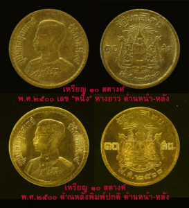 เหรียญนี้นับว่าเป็นตัวติดที่ขึ้นชื่อว่าหายาก และหาของสวยๆได้ยากมาก เรียกว่าต้องหากันจนรองเท้าสึกกว่าจะได้ แต่ถ้าบล็อคเดียวกันนี้และเป็นเนื้อทองแดงจะหาได้ง่ายกว่า อายุของเหรียญก็กว่า 50 ปีแล้วจะไปหาของได้ที่ไหนเท่าที่พอจะเจอะเจอก็มักจะสึกหรือลื่นจนไม่อยากเอาไปเข้าเซทเข้าพวกเพราะความสวยไปด้วยกันไม่ค่อยได้เหลือเพียงศักดิ์ศรีแค่เป็นตัวติดที่หายากเท่านั้น โดยที่ด้านหน้าของเหรียญนี้จะเป็นบล็อคเดียวกันกับบล็อกปกติทั่วไป แต่ด้านหลังจะไม่เหมือนกัน โดยมักจะดูความต่างตรงเลข ๑๐ ซึ่งหางของเลข ๑ ของบล็อคที่หายากจะยาวลงมามากกว่าบล็อคปกติอย่างเห็นได้ชัด เหรียญตัวนี้จัดเป็นของหายากและมีราคาแพงมาแต่ไหนแต่ไรแล้ว เวลานี้น่าจะหาแทบไม่ได้ครับ เหรียญตัวที่โพสท์มาลงก็ได้มาหลายปีแล้วจนจำ พ.ศ.ไม่ได้ ความสวยเกือบอยู่ในระดับ UNC เหรียญบล็อคนี้ถ้าเป็นทองเหลืองด้านหลังเมื่อตีแล้วมักจะขึ้นไม่ค่อยเต็ม ลวดลายขึ้นไม่ค่อยชัดบริเวณกลางเหรียญ ผิดกับเหรียญที่เป็นเนื้อทองแดงซึ่งด้านหลังจะมีลวดลายที่คมชัดกว่าครับ