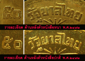 จัดเป็นเหรียญหายากครับ โดยปกติเหรียญรุ่นนี้ด้านหน้าจะมีเพียงบล็อคเดียว ส่วนด้านหลังมีสองบล็อค บล็อคที่หาง่ายและพบได้ทั่วไปจะเป็นบล็อคที่ตัวหนังสือมีขนาดที่บางกว่าโดยจะสังเกตได้ชัดที่ตัวเลข ๕๐ ซึ่งจะต่างกับบล็อคที่หายากซึ่งจะมีตัวเลขที่หนากว่า ส่วนรายละเอียดอื่นๆของบล็อคที่หายากที่บริเวณตราแผ่นดินก็จะคล้ายกันต้องสังเกตดีๆจึงจะเห็นความแตกต่างผมเองเชื่อว่าบล็อคปกติเป็นบล็อคที่สวยกว่าและเป็นบล็อคหลักของเหรียญรุ่นนี้ส่วนบล็อคตัวหนังสือหนาคงไม่ได้มีเจตนาที่จะใช้ผลิตแต่อาจจะใส่แม่พิมพ์โดยไม่ได้สังเกตแล้วตีออกมาก็เป็นไปได้ครับเหรียญรุ่นนี้หาสภาพดีๆได้ค่อนข้างยากส่วนใหญ่เป็นเหรียญใช้งานแล้วเกือบทั้งนั้น ถึงเวลานี้ผ่านมาตั้ง 60 กว่าปีแล้วจะเหลือให้เห็นสักกี่เหรียญครับ