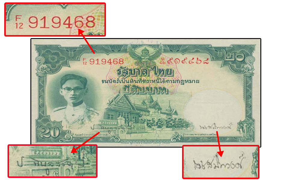 แบงค์ 20 บาท รุ่นที่ว่านี้ ในวงการสะสม เรียกว่า “ธนบัตร 20 บาท แบบที่9” ผลิตโดยบริษัทโทมัส เดอ ลา รู ประเทศอังกฤษ โดยปกติแล้วราคาตลาดสะสมของแบงค์รุ่นนี้ ณ ปัจจุบันอยู่ที่ประมาณ ใบละ 300-400 บาท แต่ถ้าเป็น”พระพักตร์หนุ่ม”(หน้าหนุ่ม) “ตัวเลขสีแดง” “หมวดF12” และเป็นลายเซ็นต์ “ป.พิบูลสงคราม-เดช สนิทวงศ์” ซึ่งผลิตจำนวนน้อยมาก จะกลายเป็นธนบัตรที่มีราคาสูงหลักแสนจริงๆครับ และยิ่งถ้าหากเป็นสภาพสวย เก็บรักษาดี ก็จะมีราคาค่าตัวสูงกว่า 250,000 บาท ลองตรวจสอบจุดที่ใช้พิจารณาได้ตามภาพด้านล่างนี้ครับ